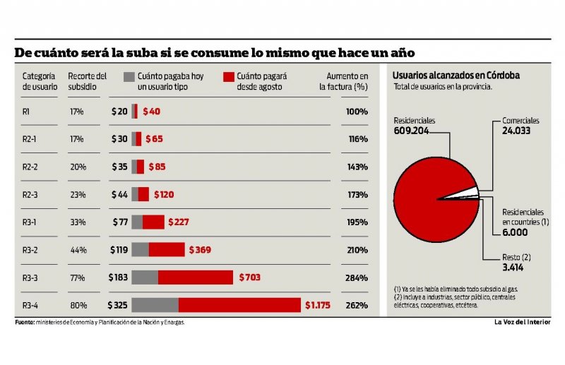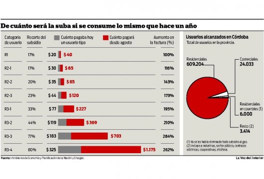 Hecha la advertencia, de la presentación de los ministros se infiere que unos 609.204 usuarios residenciales cordobeses (otras 6.000 conexiones corresponden a viviendas en countries y ya estaban excluidas de todo subsidio) reciban aumentos, según sus categorías, como los descriptos en la infografía. Se estima que 55 por ciento de los hogares cordobeses sufrirá subas menores a 172 por ciento, mientras 45 por ciento restante sufrirá aumentos mayores a 194 por ciento.
